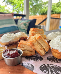 4 House-Made Buttery, Flaky Biscuits – Baked fresh with love, these golden biscuits are perfect on their own or dressed up with our sweet spreads.